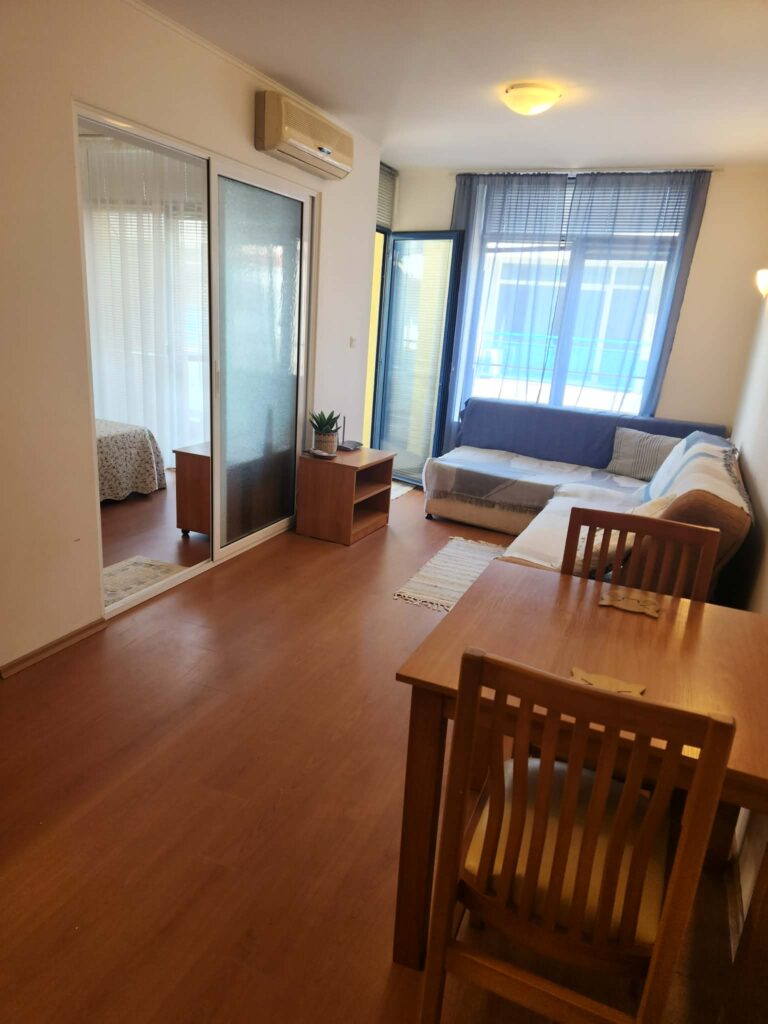 Апартамента е с площ 49 кв..Апартаментът се състои от светла всекидневна с кухненски бокс, спалня,баня и тераса с гледка към градината и басейна. Жилището е напълно обзаведено и готово за нанасяне или за отдаване като инвестиционен имот.